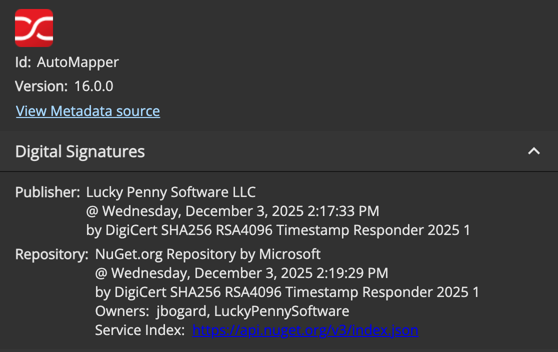 This shows that the AutoMapper (and MediatR) packages were published by Lucky Penny Software (my company) and not...Unlucky Penny Software? Getting this additional security verification is important for customers to know that this package comes from us and not some other entity. Getting verified for code signing certificates is a fairly involved process doing things like "taking selfies with my passport".